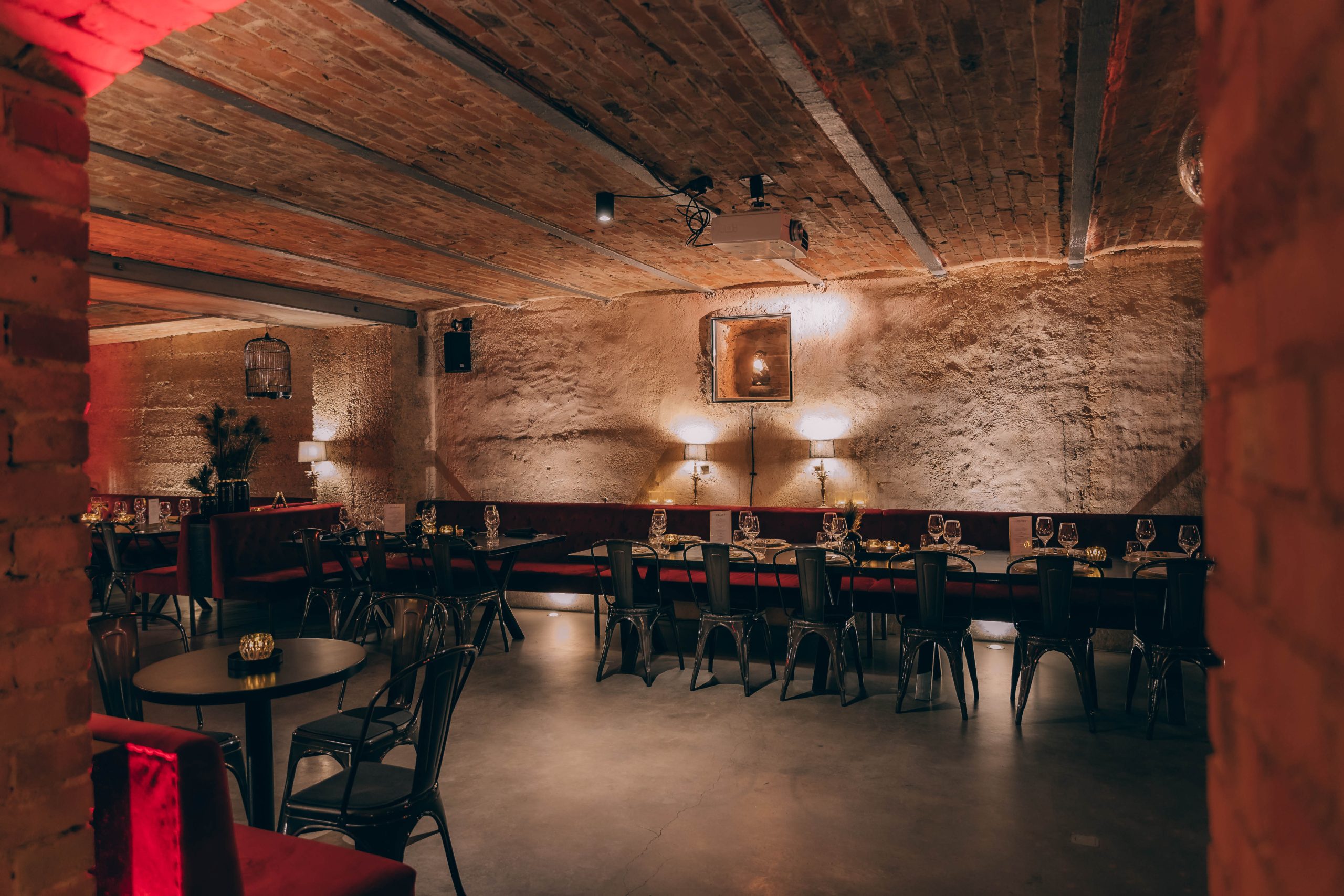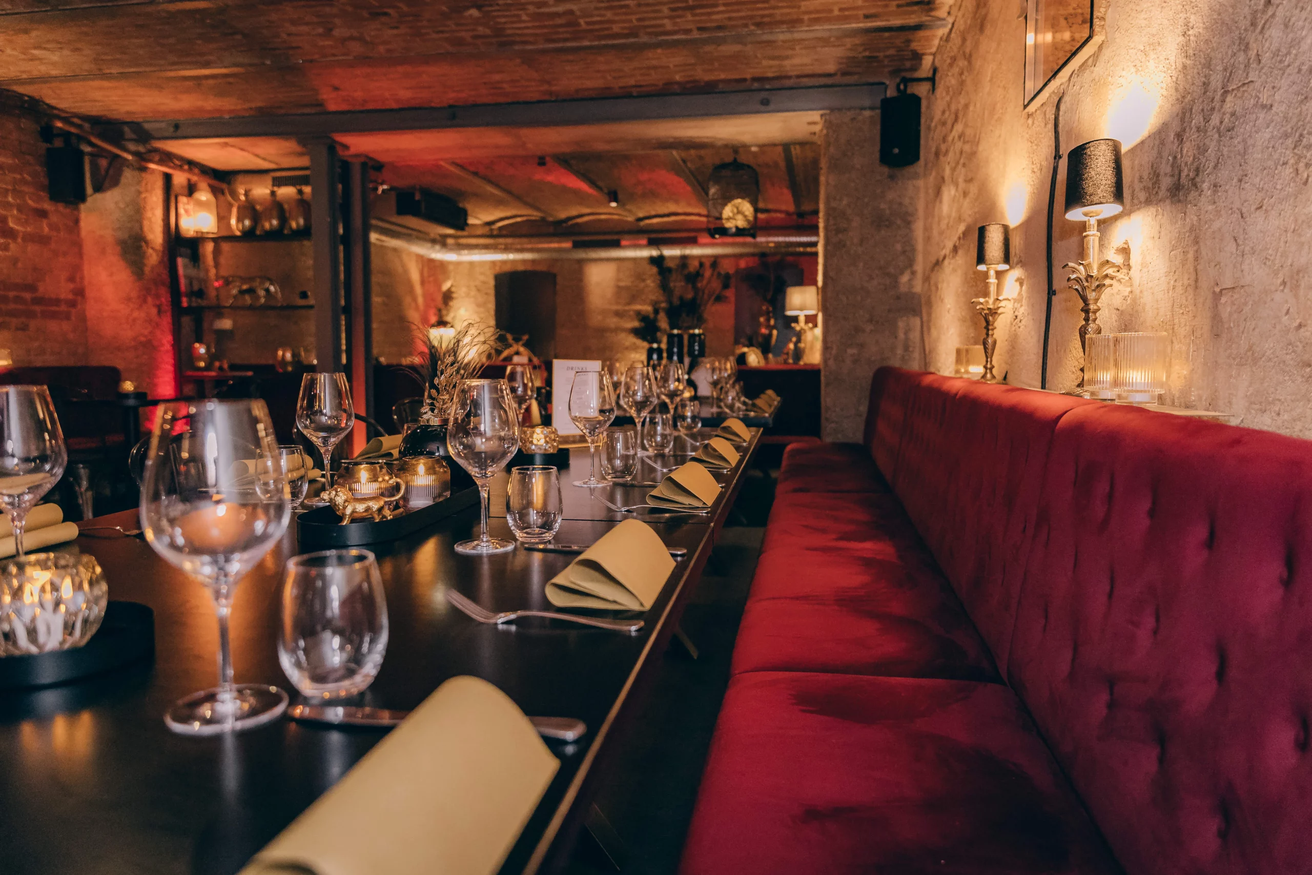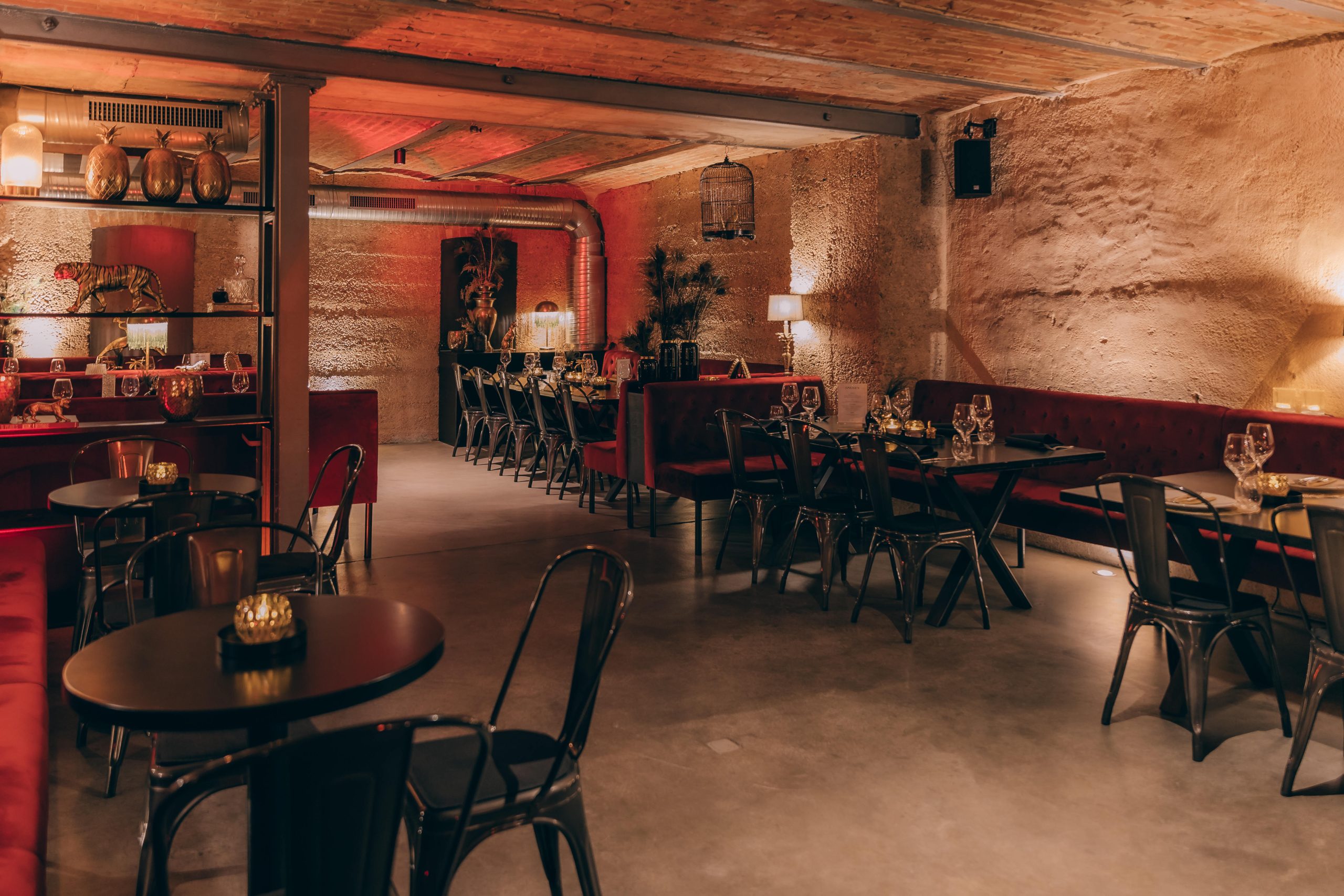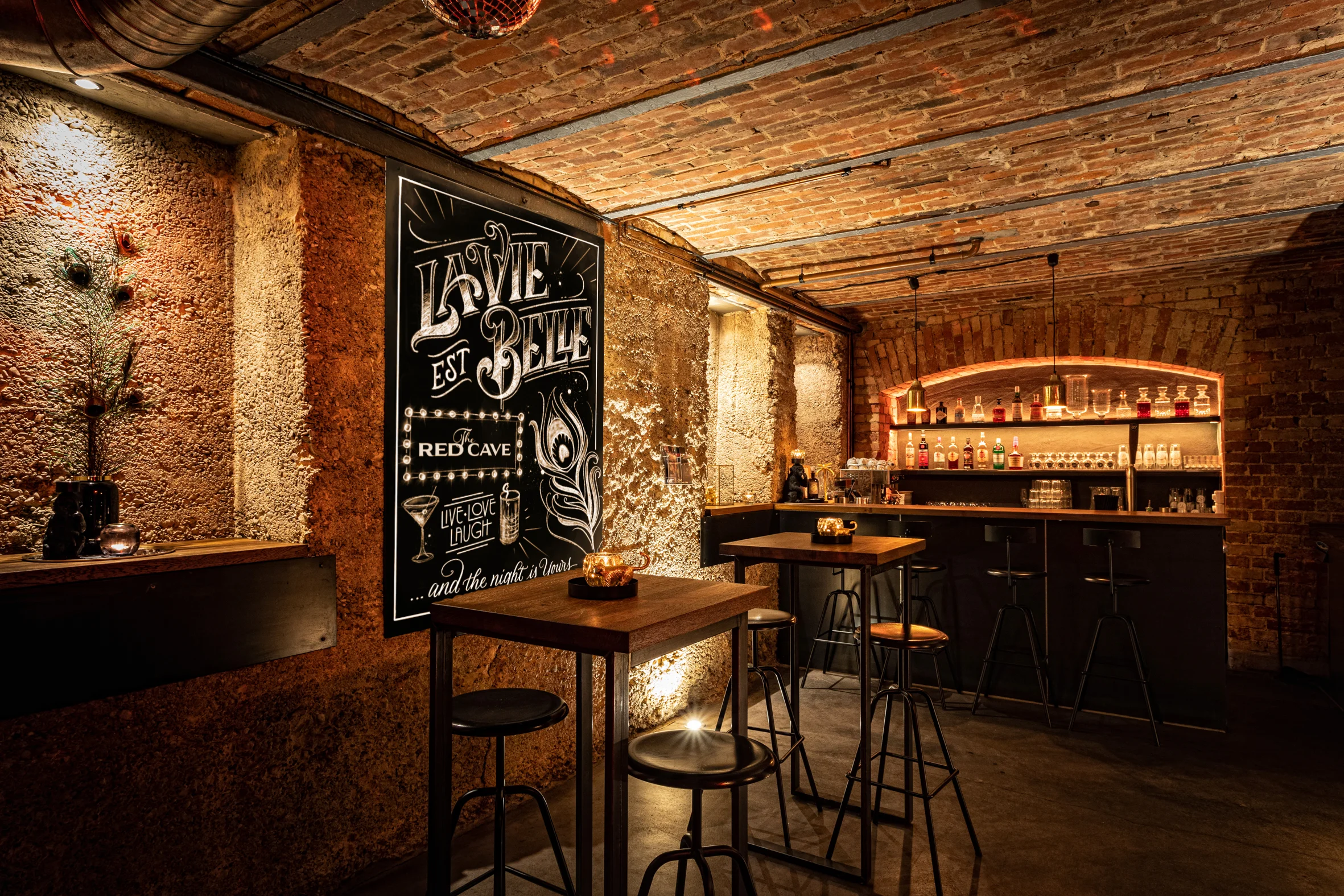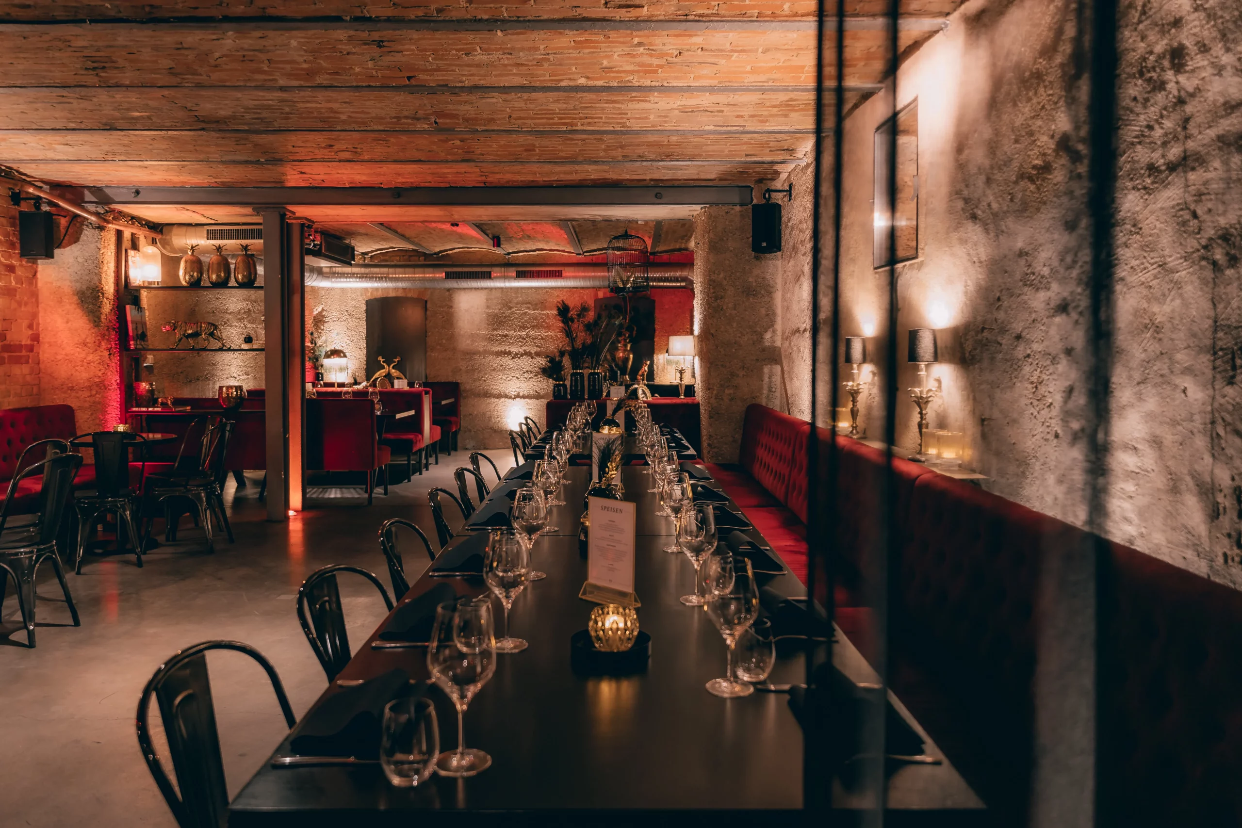 Ein burleskes Ambiente, das in Stuttgart seinesgleichen sucht. Roter Samt, schwarze Tische mit Stahlgestell und ausgewählte goldene Details treffen auf das charaktervolle Gewölbe. Das Zusammenspiel aus Licht, Material und Raum schafft eine dichte, stilvolle Atmosphäre mit besonderer Wirkung.