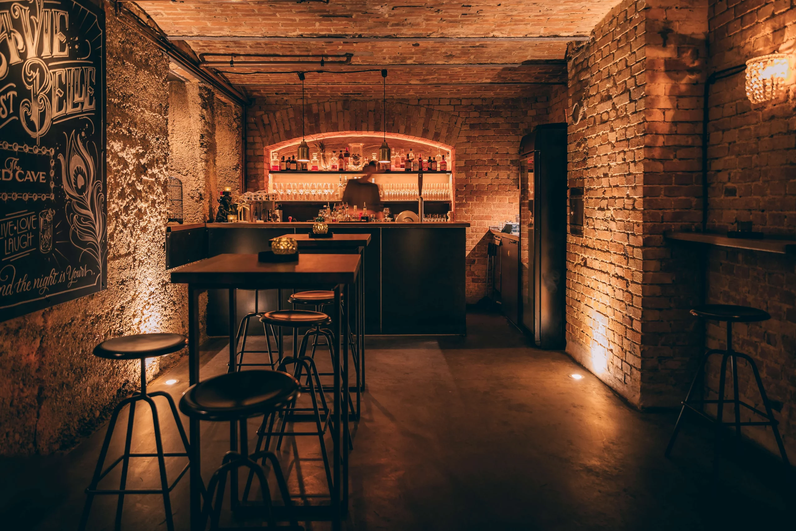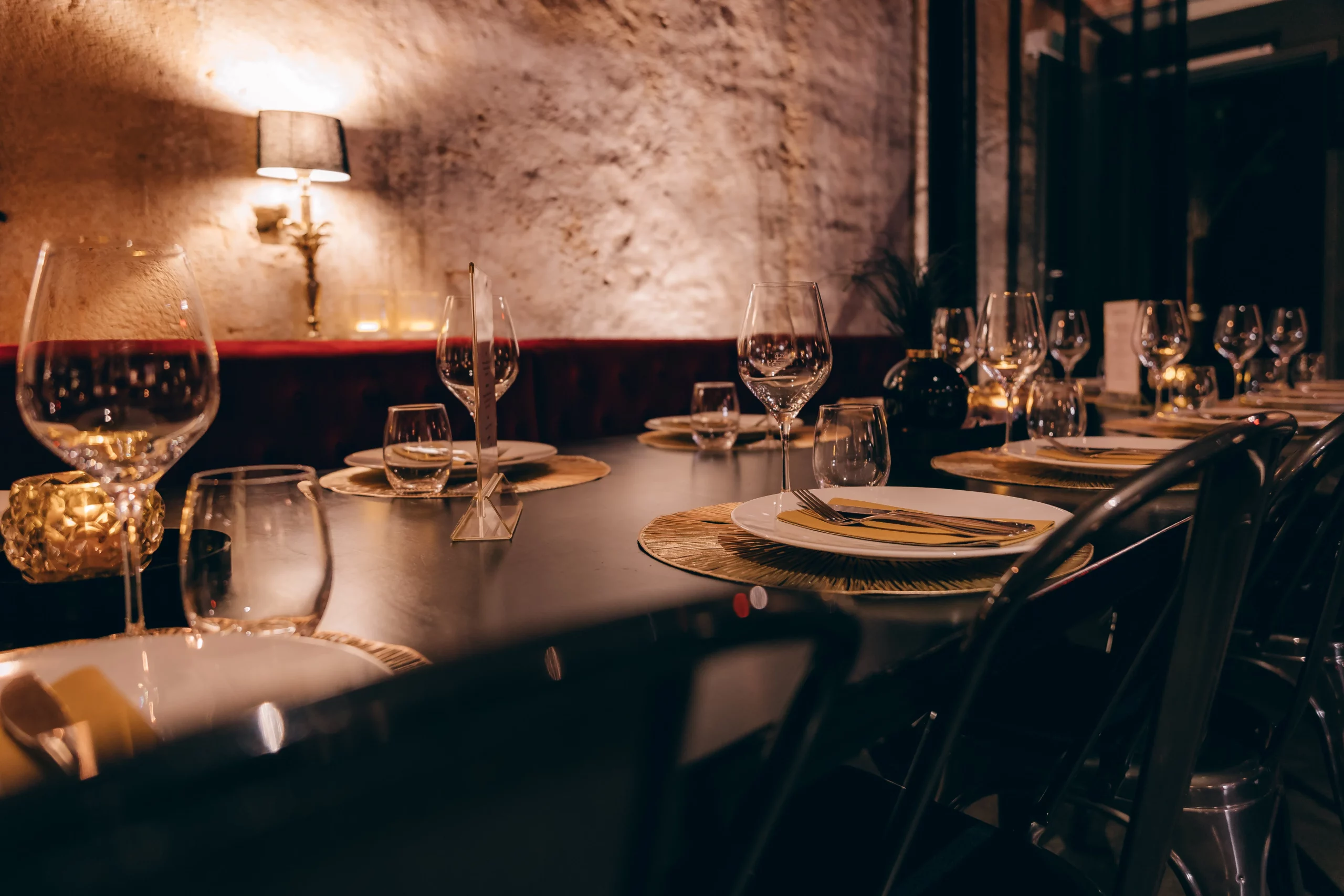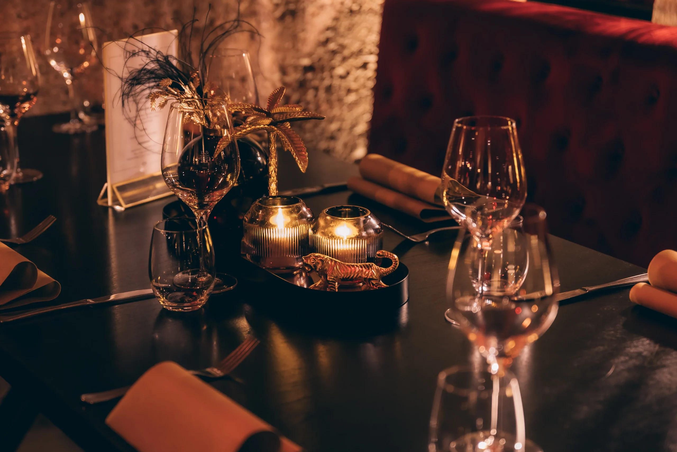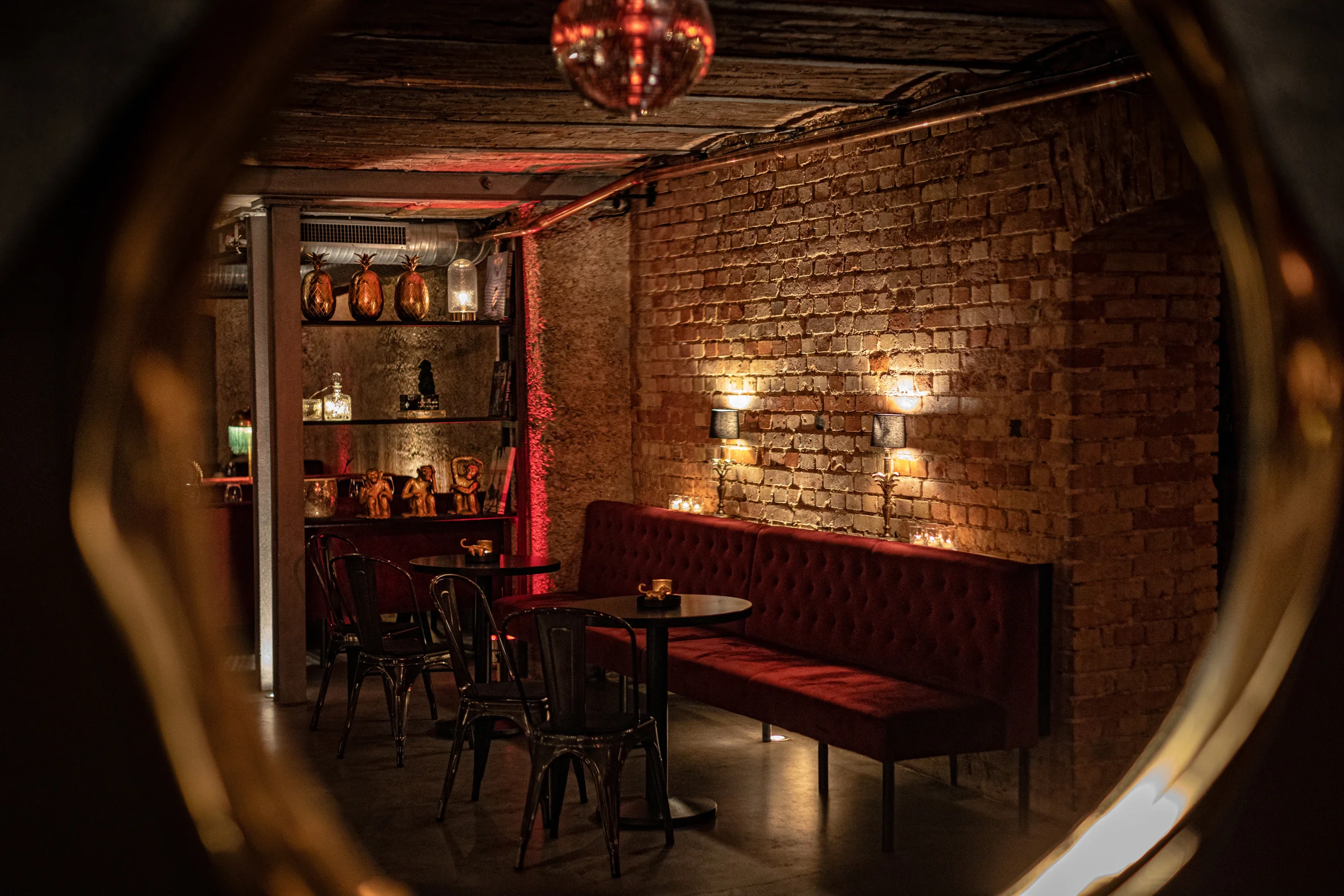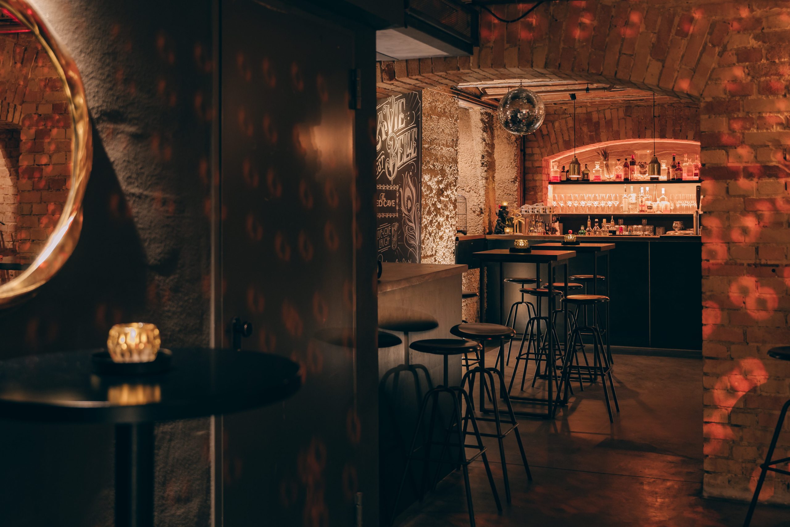 Ein burleskes Ambiente, das in Stuttgart seinesgleichen sucht. Roter Samt, schwarze Tische mit Stahlgestell und ausgewählte goldene Details treffen auf das charaktervolle Gewölbe. Das Zusammenspiel aus Licht, Material und Raum schafft eine dichte, stilvolle Atmosphäre mit besonderer Wirkung.