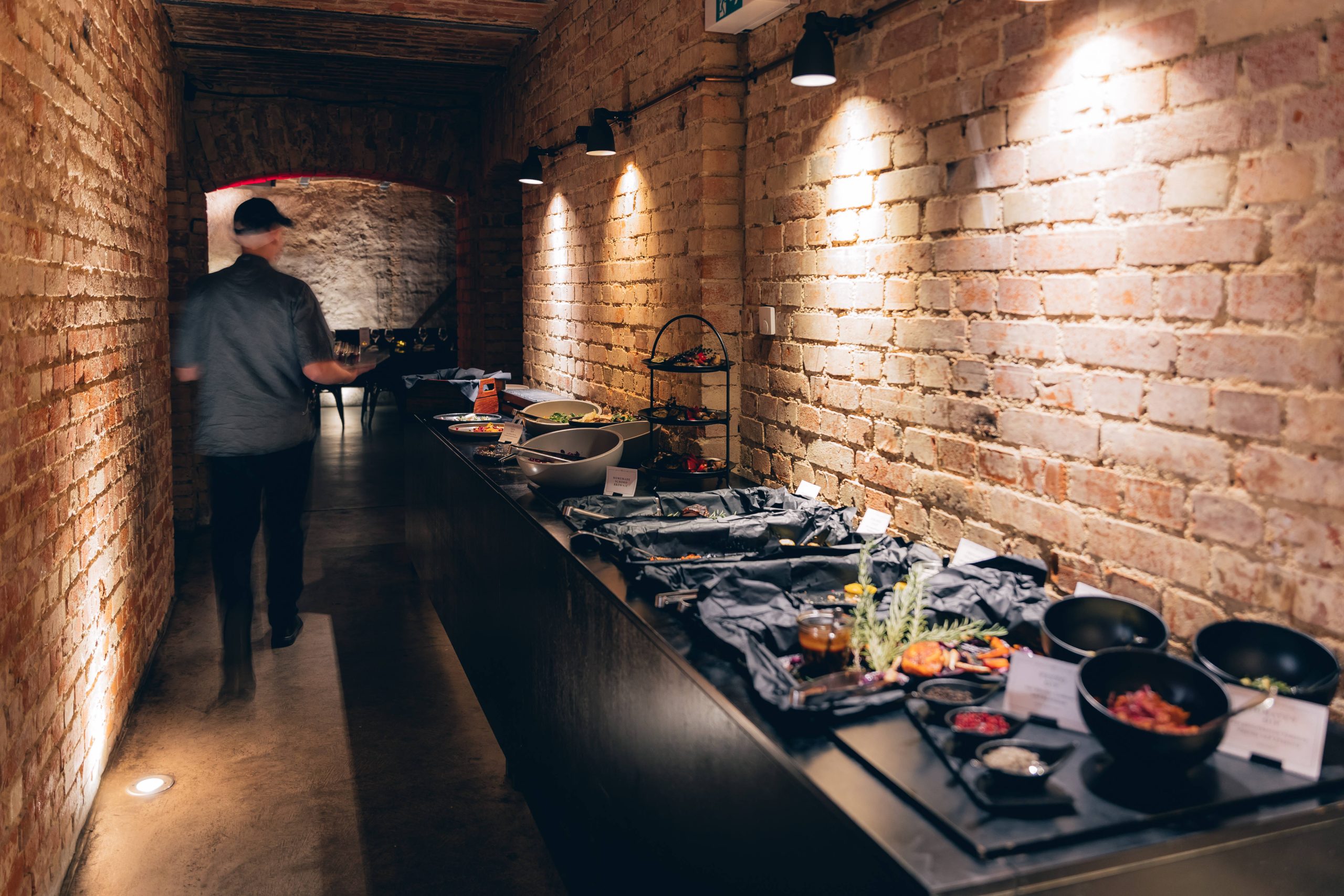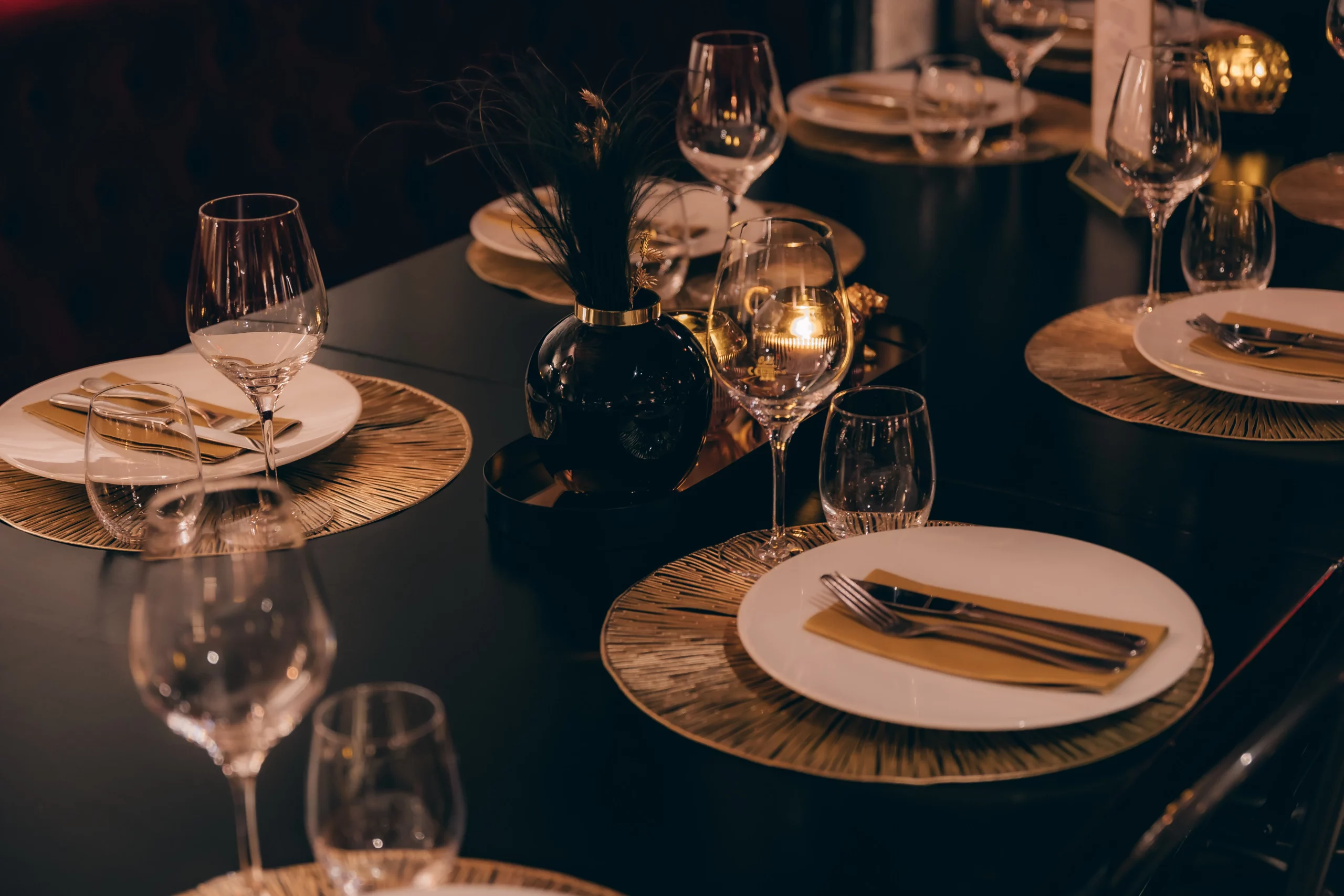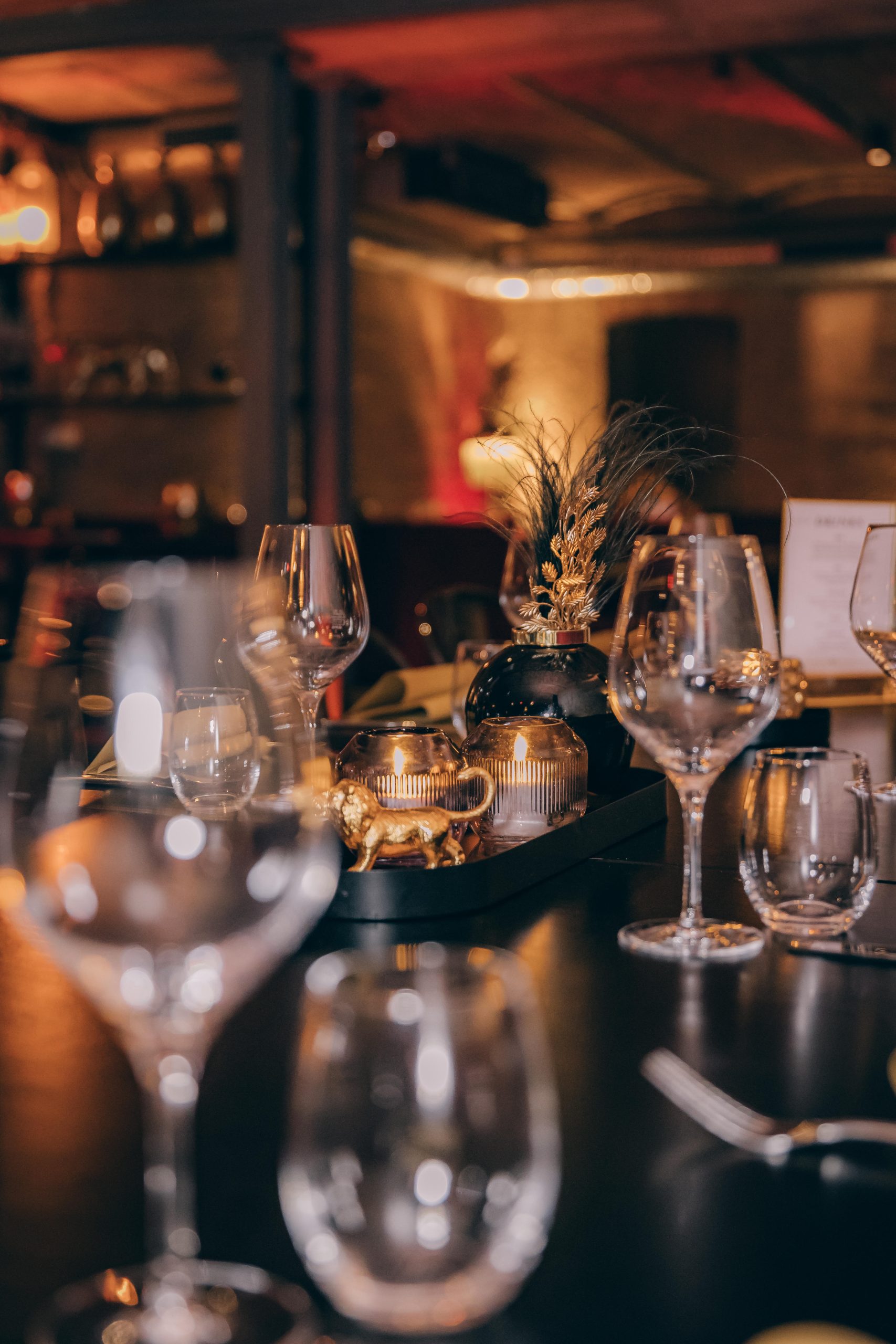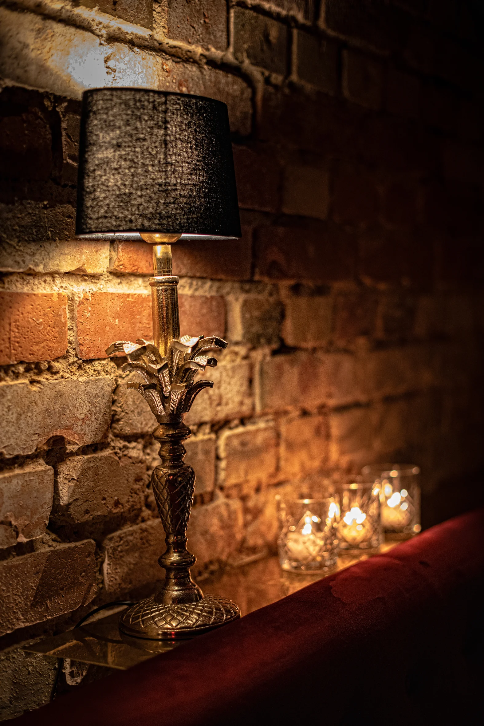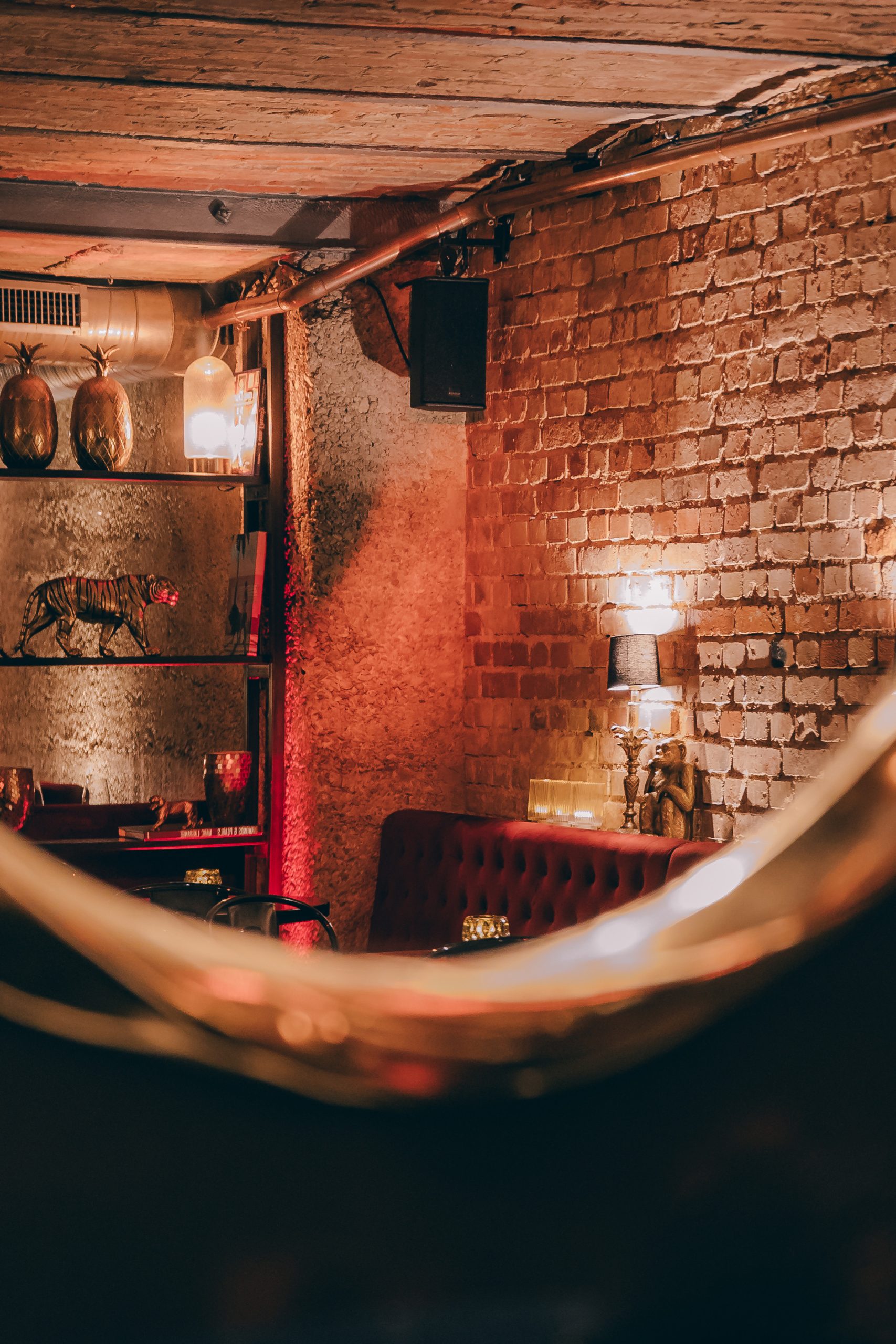 Ein burleskes Ambiente, das in Stuttgart seinesgleichen sucht. Roter Samt, schwarze Tische mit Stahlgestell und ausgewählte goldene Details treffen auf das charaktervolle Gewölbe. Das Zusammenspiel aus Licht, Material und Raum schafft eine dichte, stilvolle Atmosphäre mit besonderer Wirkung.